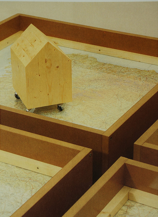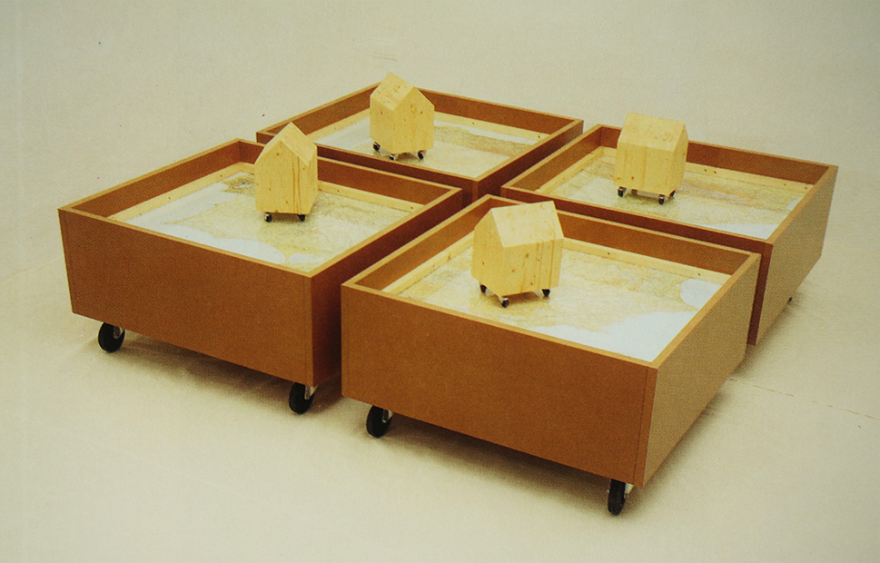 Madera, cristal, papel y ruedas, 80 x 100 x 100 cm x4